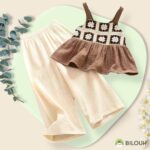 Conjunto verano café de blusa de tirantes con bordado de flores en el pecho y pantalón, de tela fresca