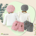 Conjunto de boina y short con detalles en cuadros blanco y negro con blusa de manga larga y olanes