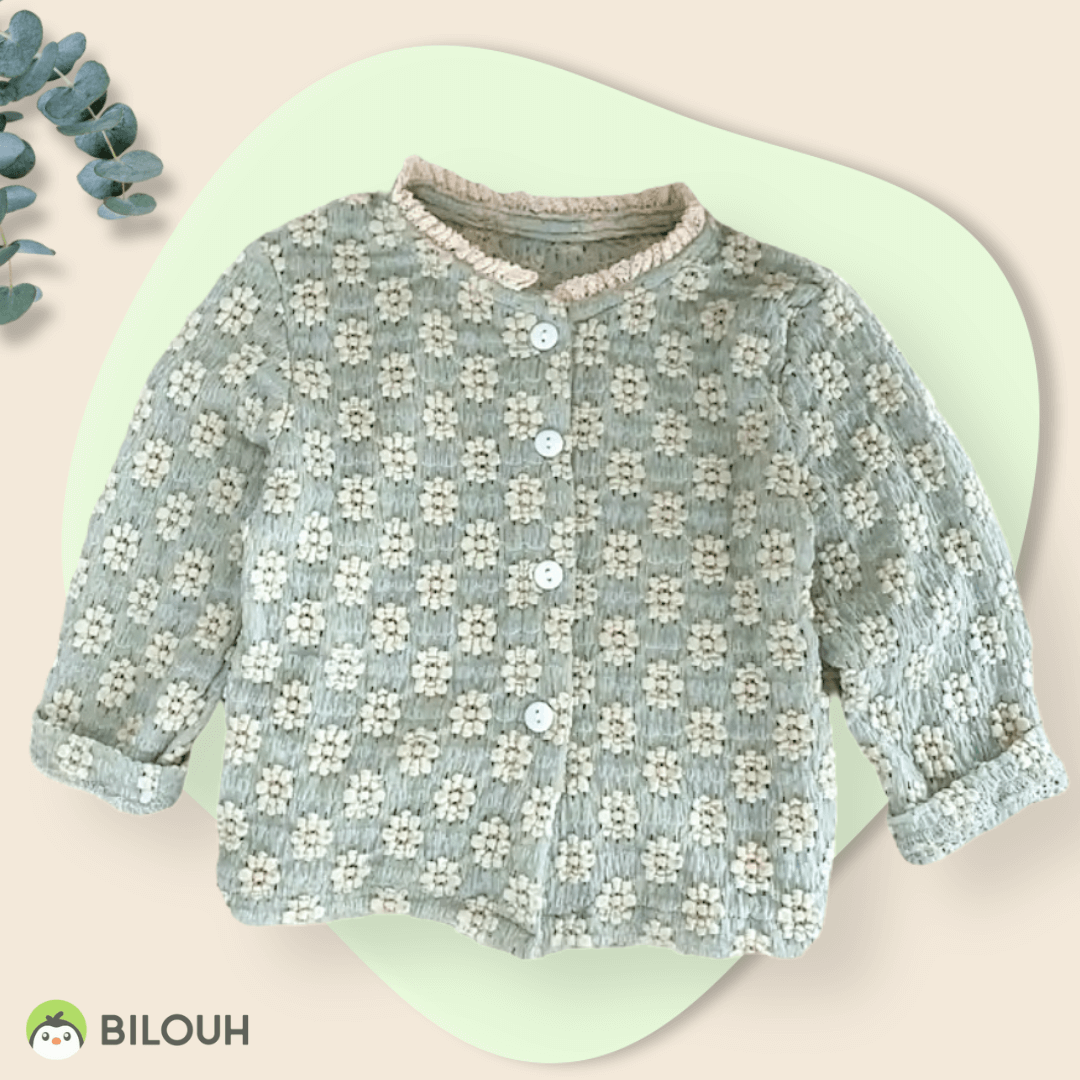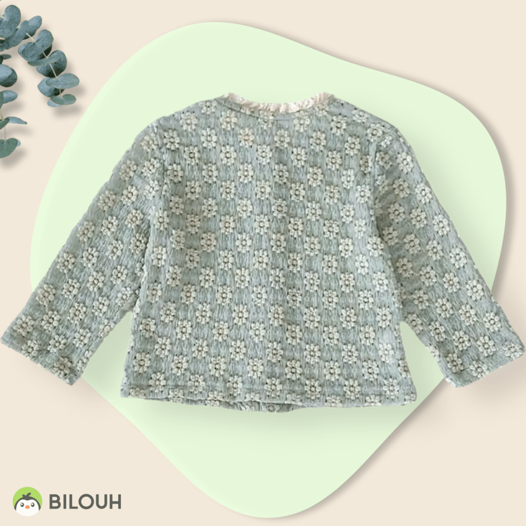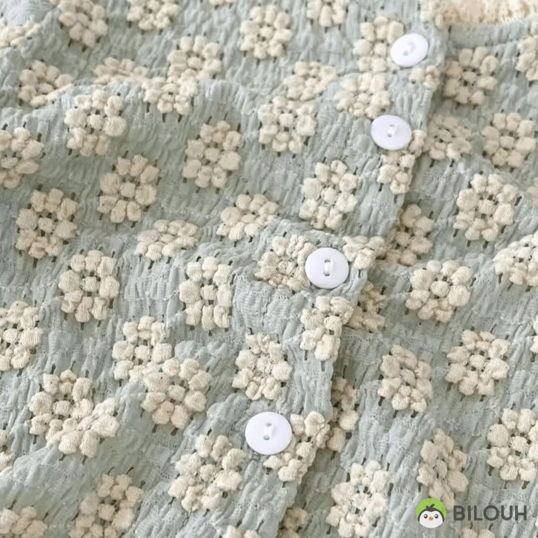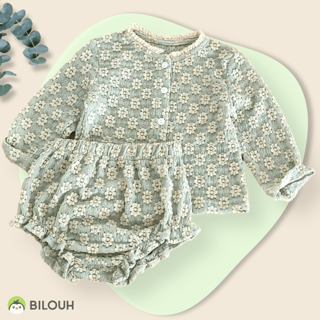 Este sofisticado conjunto de algodón presenta un diseño floral, incluyendo una blusa de manga larga con botones y cuello redondo, así como un calzoncillo a juego.