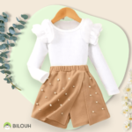 Conjunto de falda short en tono café claro con perlas y blusa blanca en manga larga
