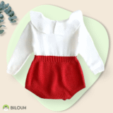 Este elegante pañalero, confeccionado en algodón de alta calidad, presenta una sofisticada combinación de colores rojo y blanco. Su diseño incluye un cuello redondo con una solapa, lo que le confiere un aspecto distinguido y refinado.