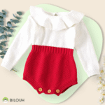 Este elegante pañalero, confeccionado en algodón de alta calidad, presenta una sofisticada combinación de colores rojo y blanco. Su diseño incluye un cuello redondo con una solapa, lo que le confiere un aspecto distinguido y refinado.