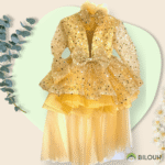 Vestido de fiesta esponjoso en tono dorado con hojuelas brillantes ideal para un evento formal, tu pequeña se verá como toda una princesa