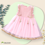 Vestido rosa de tul con estrellas. Sin mangas con cuello redondo