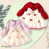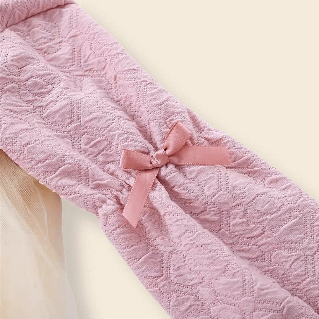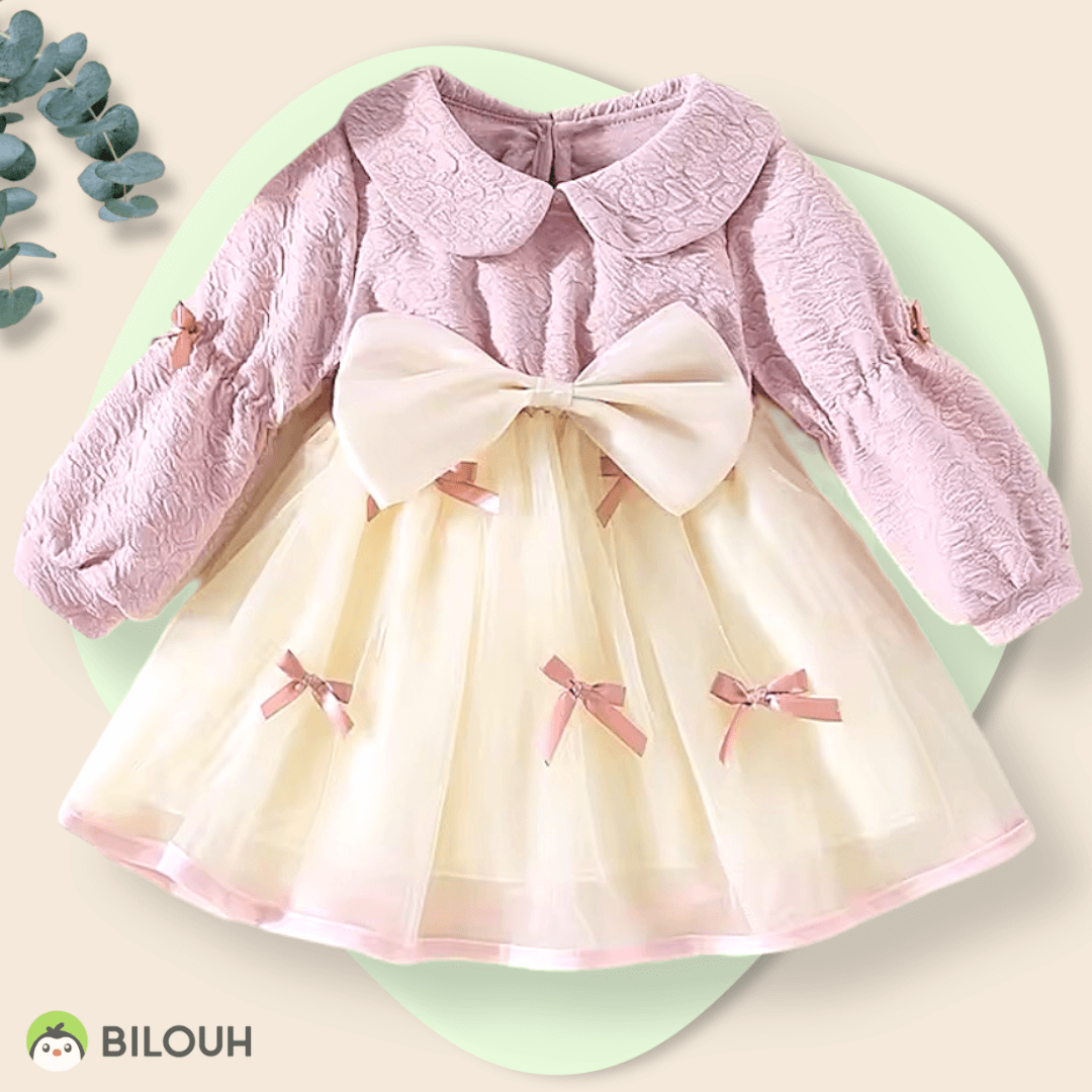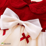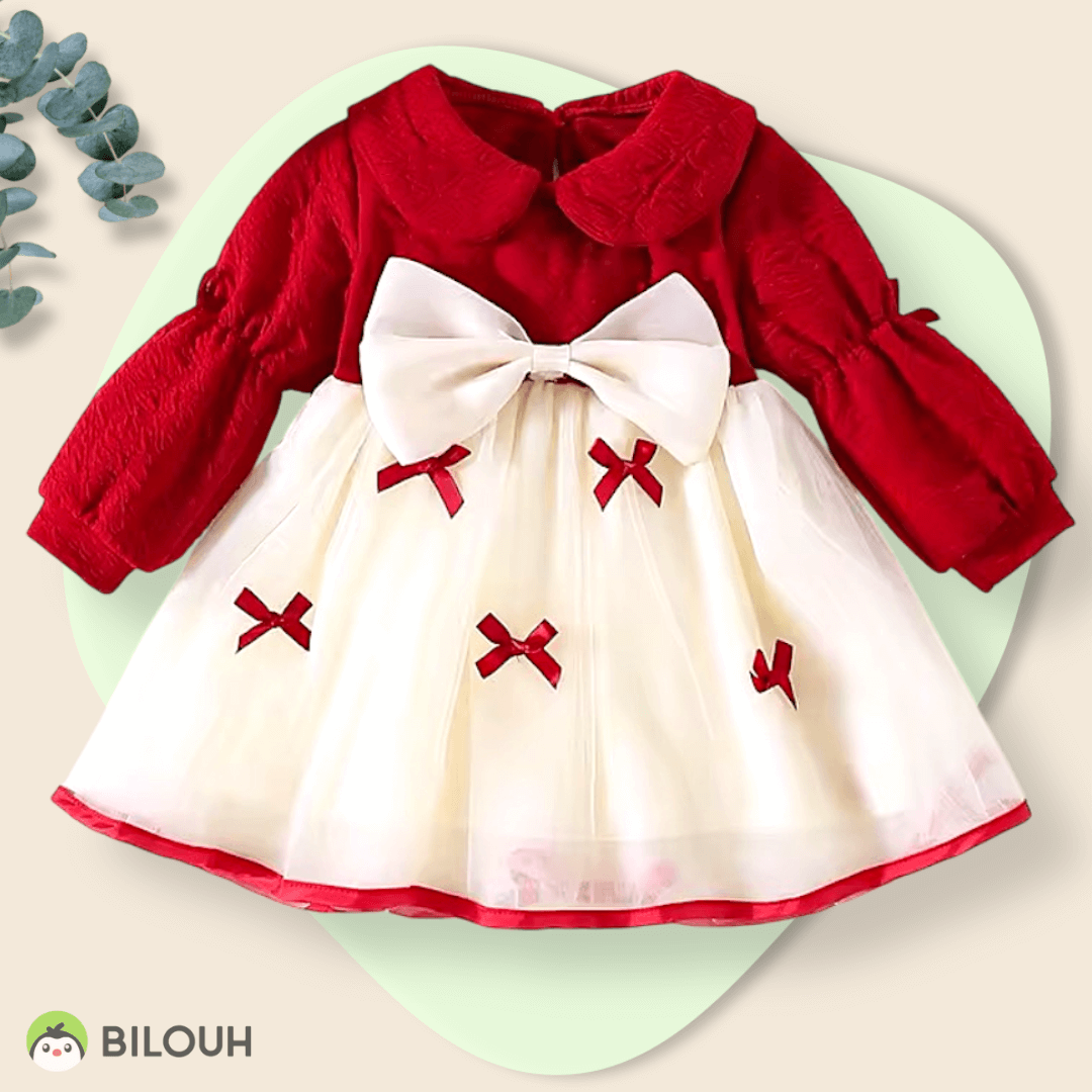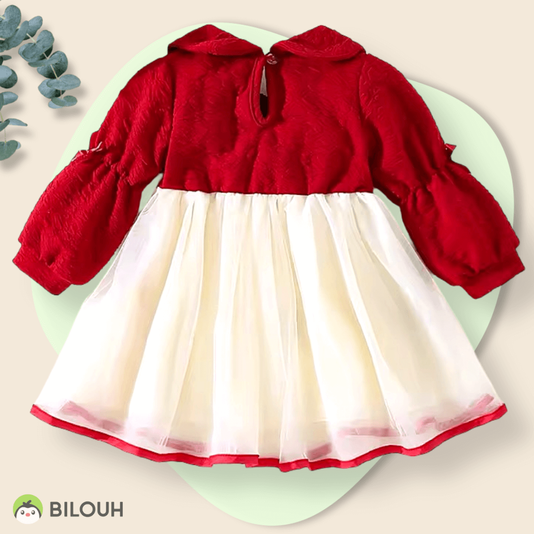 Vestido de invierno sofisticado con mangas farol, confeccionado en tela con detalles texturizados de corazones.