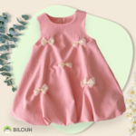 Vestido rosa sin mangas, el vestido es esponjoso, es amplio. De tela suave con detalles de moños