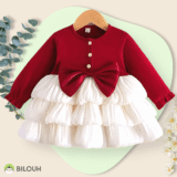 Este vestido de algodón de manga larga, complementado con una falda de organza que aporta elegancia y fluidez, es ideal para eventos formales y casuales.