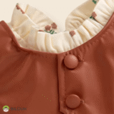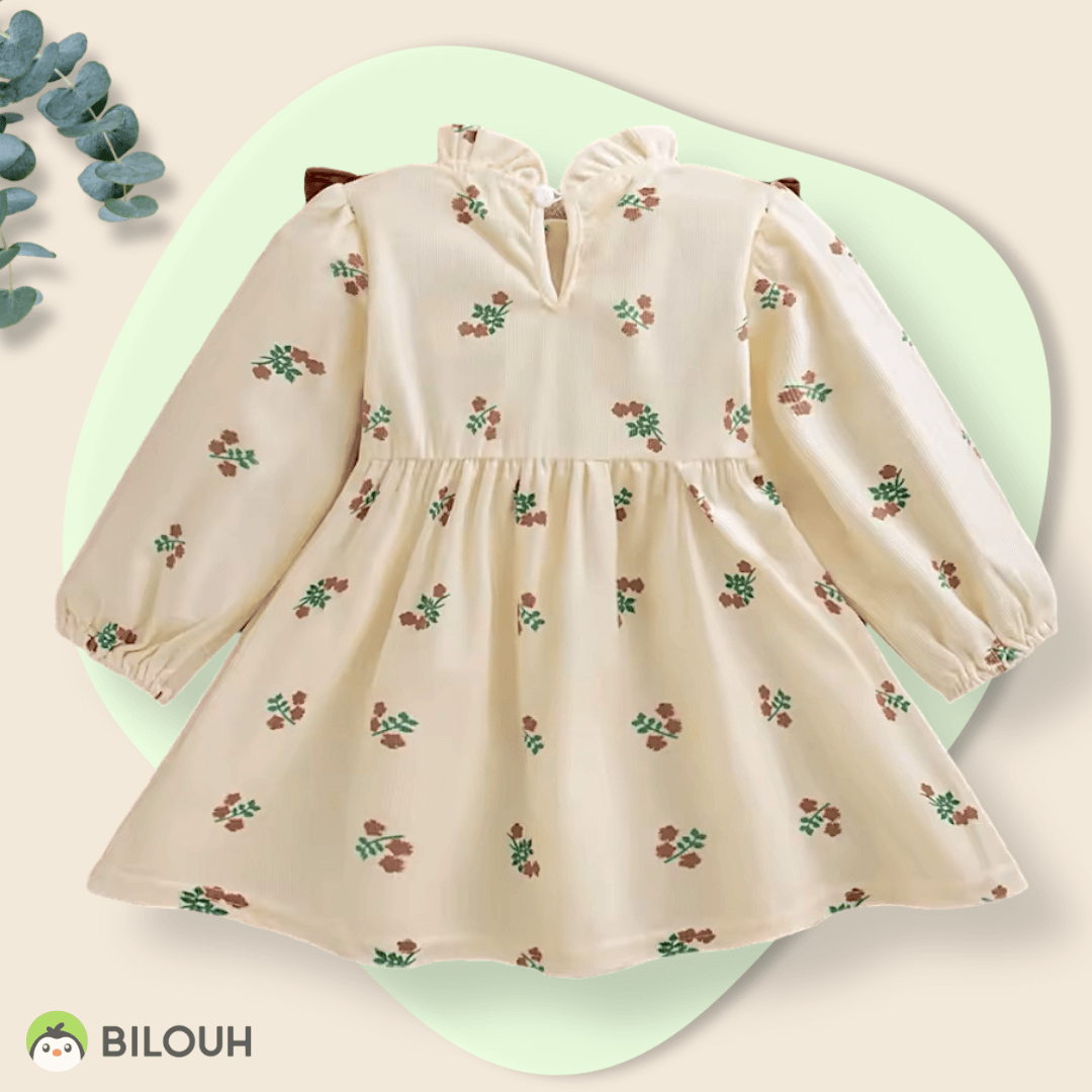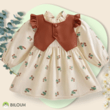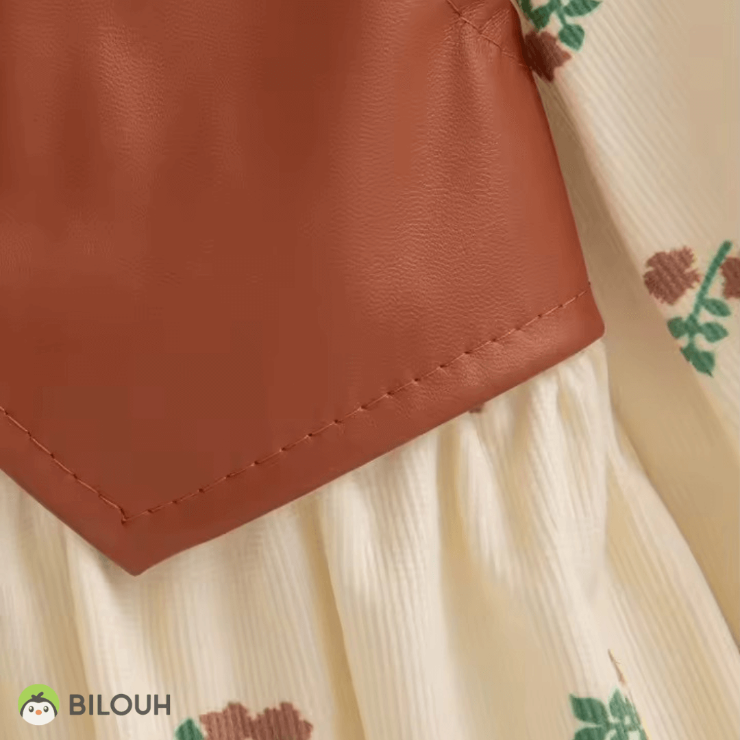 Vestido pana otoño con estampado floreado en manga larga, con un detalle de chaleco de piel sintética en un tono café otoñal