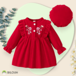 Vestido otoño con boina, en tono rojo. Con bordado de flores en el pecho