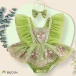 Vestido tipo pañalero de tul suave con bordados hechos a mano, es perfecto para la sesión de fotos de tu bebé