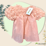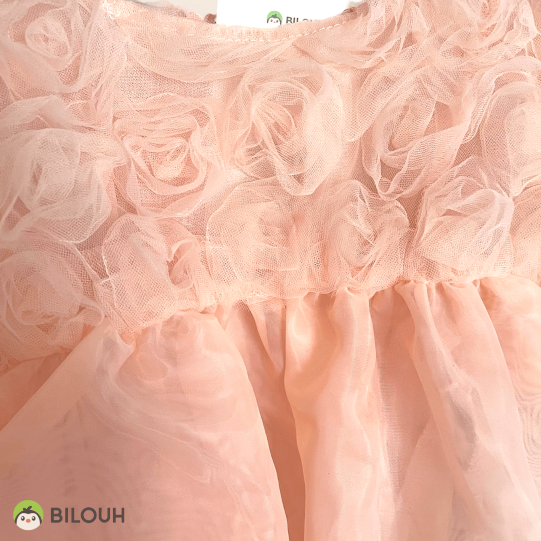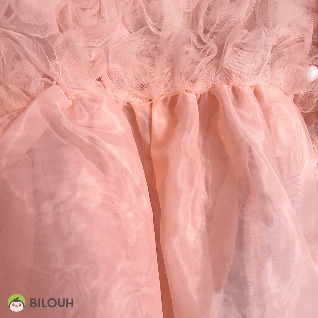 Vestido de organza con decoración de flores y perlas en las mangas.